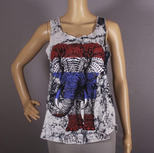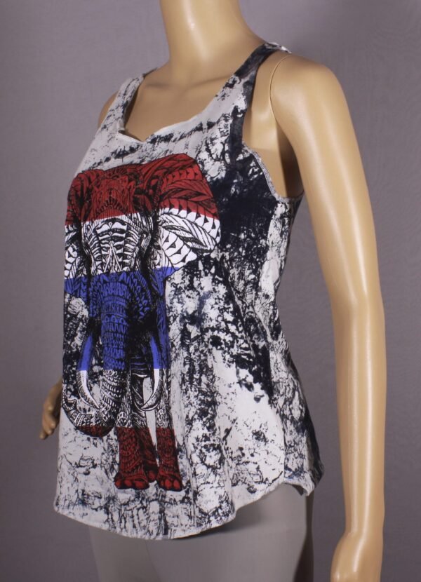 Racer Back Top in White with Elephant Print.