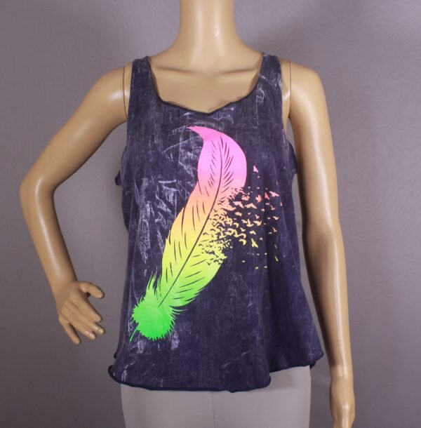This stylish and comfortable tank top features a beautiful hand-block printed dream cathcer design on a soft, light-colored fabric. The distressed denim finish fabric adds a vintage vibe, making it perfect for any casual occasion. The tank top is made from a lightweight and breathable cotton blend, making it perfect for warm weather wear. The relaxed fit and scoop neck provide a flattering and comfortable silhouette.