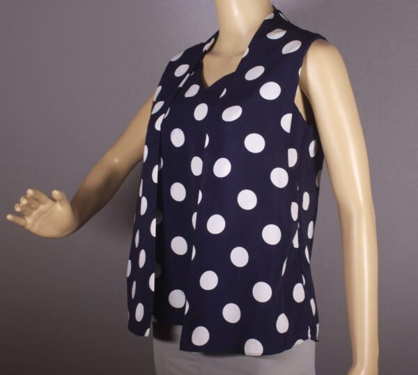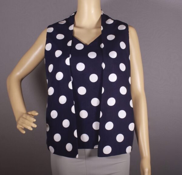 Add a versatile and stylish touch to your wardrobe with this sleeveless polka dot top. Designed in a modern navy blue with big white polka dots, this top offers a sophisticated yet relaxed look. The lightweight fabric ensures all-day comfort, while the open-front overlay adds a flattering and layered effect.