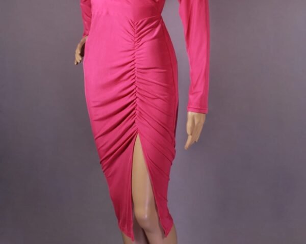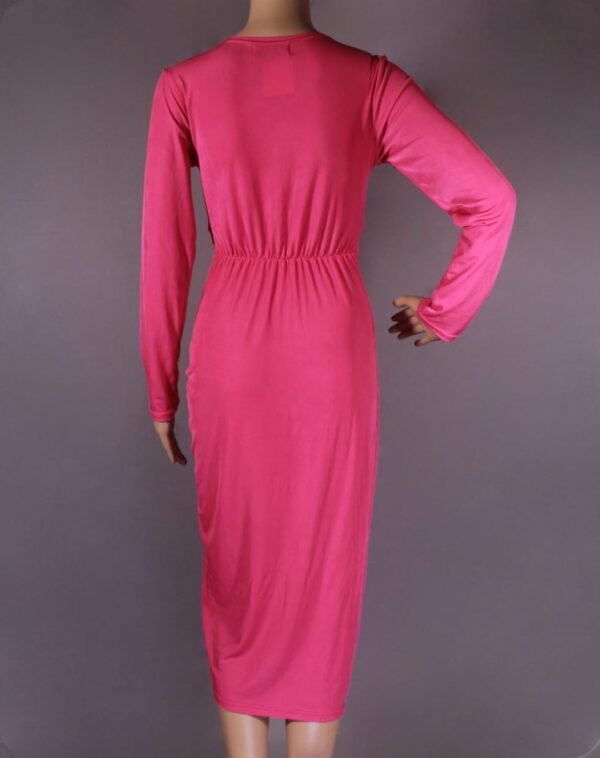 This chic midi dress is designed for women who love elegance and flair. It features a flattering wrap-style V-neckline and long sleeves, perfect for transitioning between seasons. The ruched detailing along the side adds a slimming effect and creates a graceful draped look. Made from a soft, stretchy fabric, it ensures comfort without compromising style. This hot pink dress is a versatile addition to any wardrobe. The midi length and side slit add just the right amount of sophistication and allure.