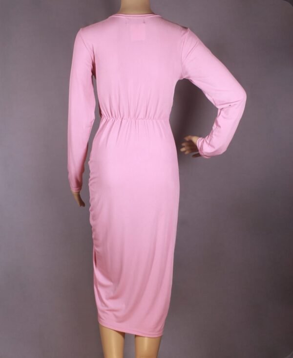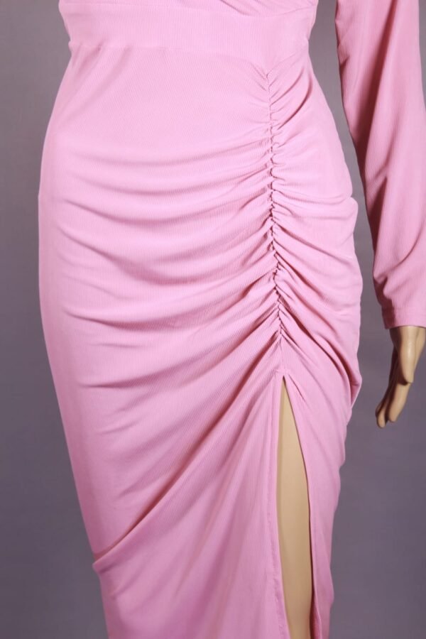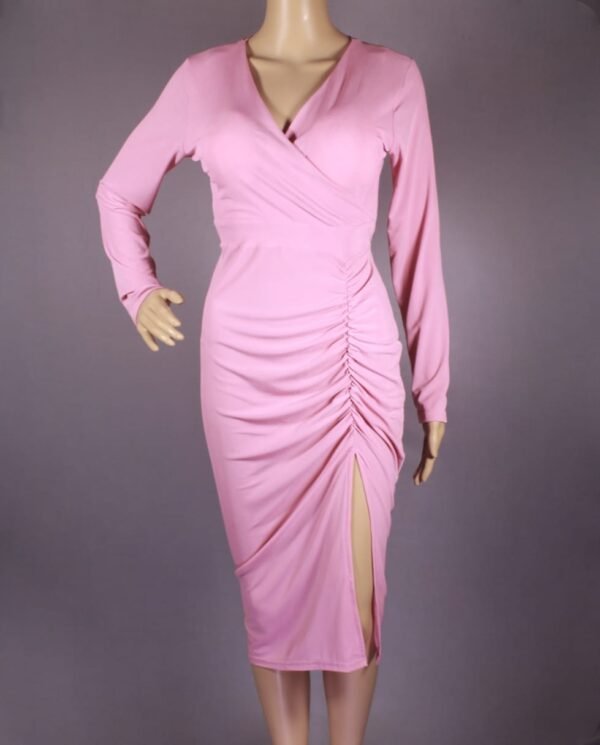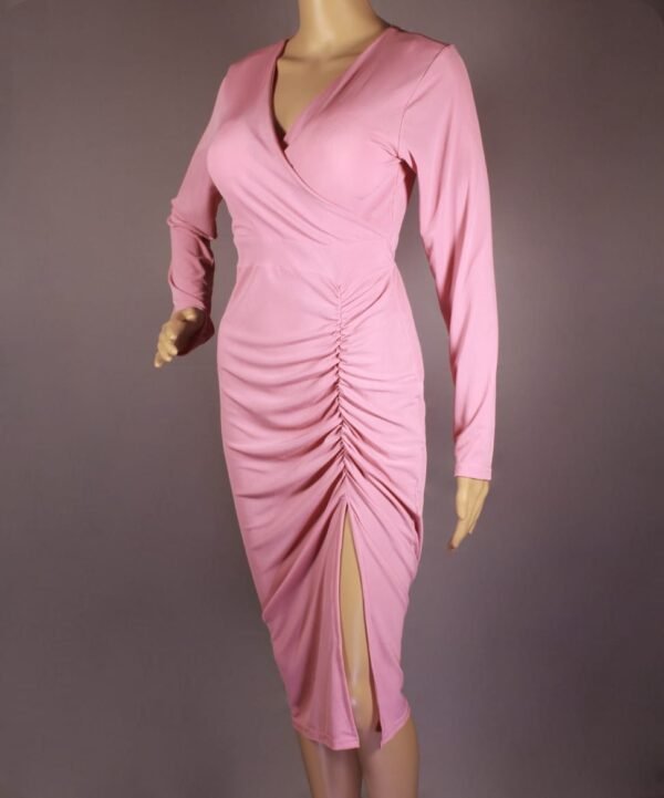 This chic midi dress is designed for women who love elegance and flair. It features a flattering wrap-style V-neckline and long sleeves, perfect for transitioning between seasons. The ruched detailing along the side adds a slimming effect and creates a graceful draped look. Made from a soft, stretchy fabric, it ensures comfort without compromising style. This blush pink dress is a versatile addition to any wardrobe. The midi length and side slit add just the right amount of sophistication and allure.