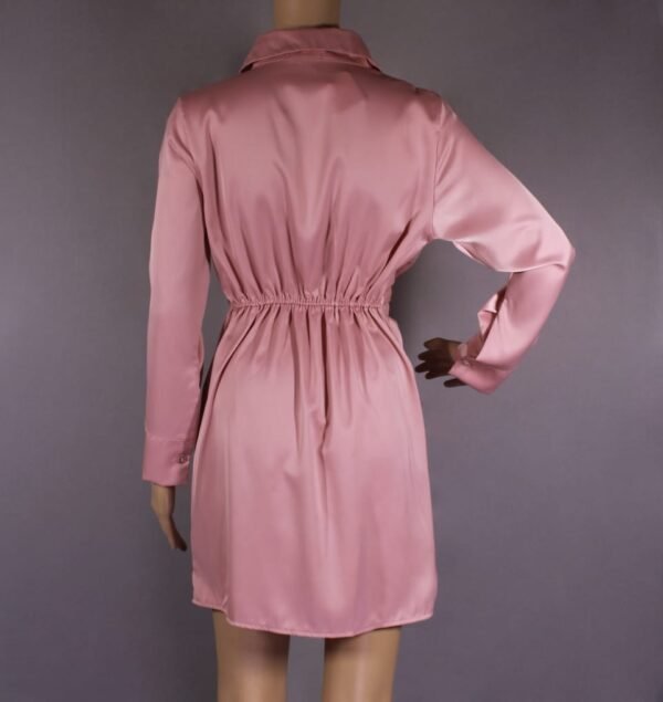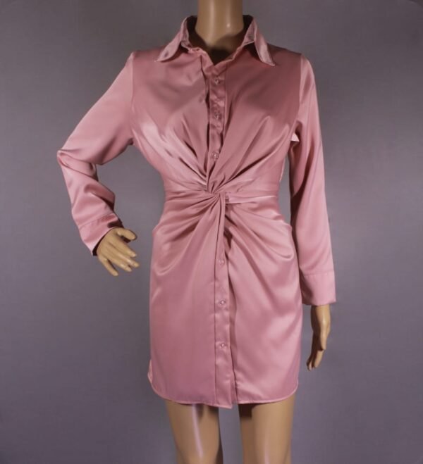 Turn heads effortlessly in this Onion Pink Satin Shirt Dress! Designed with a polished collared neckline and long sleeves, this dress brings a fresh twist to classic sophistication. Its standout feature is the intricately twisted front detailing, which adds a flattering, cinched silhouette. The silky satin fabric gives a luxurious finish, perfect for occasions where elegance meets comfort.