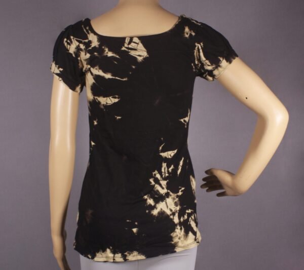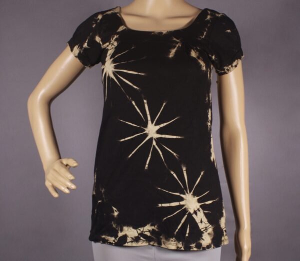 Elevate your wardrobe with this stunning tie-dye top, offering a unique blend of modern aesthetics and classic charm. Bold and dynamic, this top features eye-catching beige starburst patterns on a sleek black base, ideal for making a statement. Crafted from soft, breathable fabric, this top features a flattering scoop neckline and subtly puffed short sleeves, ensuring both style and comfort. Perfect for casual outings or relaxed days at home, these tops add a splash of individuality to your look.