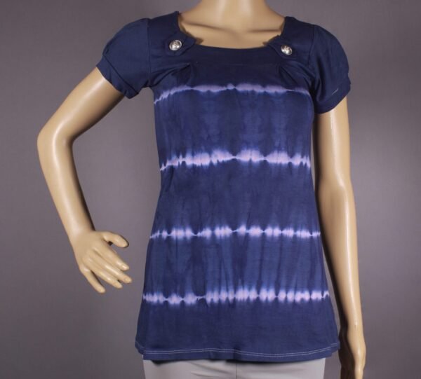 This dreamy tie-dye top blends rich shades of dark blue and light pink with a structured design featuring decorative button accents on the shoulders. Its unique look is ideal for casual or semi-formal occasions.