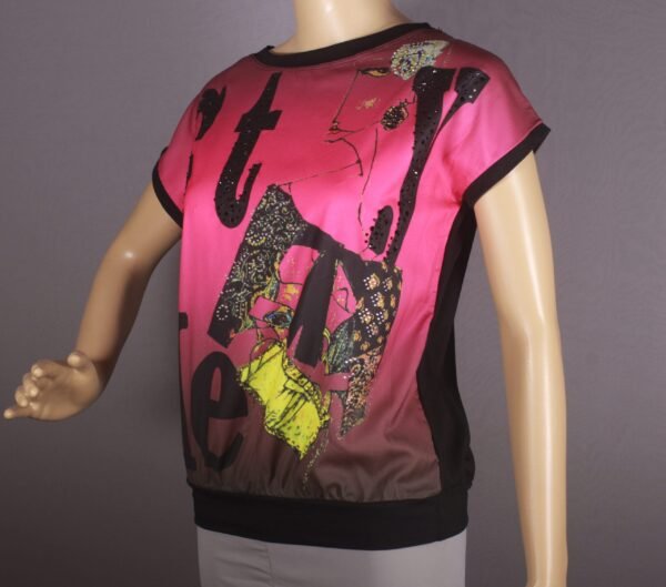 Make a bold statement with this vibrant printed top, designed to add a pop of color and art to your wardrobe. Featuring an abstract graphic print in vivid shades of pink, black, and yellow, this top is perfect for those who love to stand out. The unique design is enhanced with delicate embellishments that catch the light, adding just the right touch of glam.